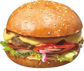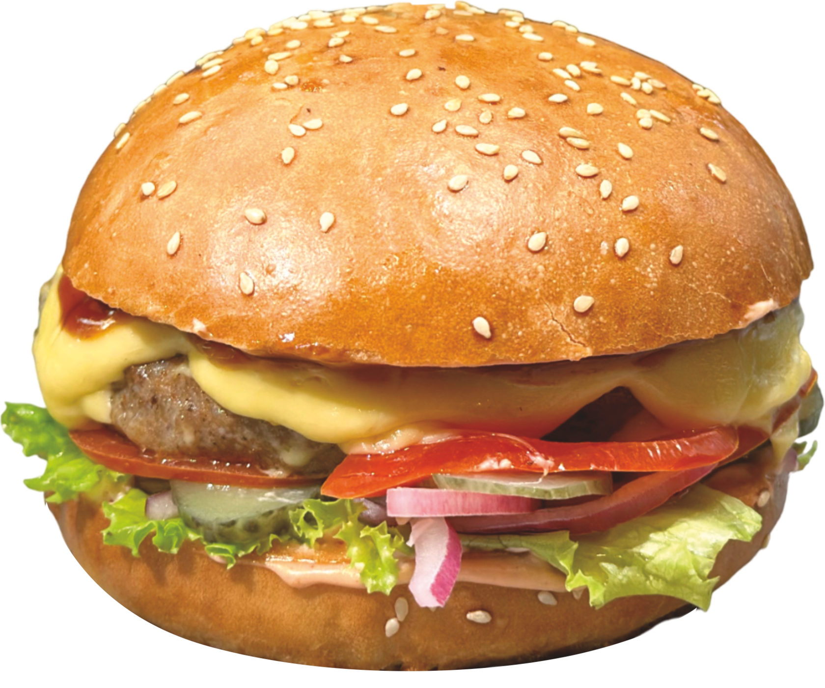 Котлета из курицы, сыр российский, сыр Гауда, грибы шампиньоны помидор, лист салата, огурец маринованный, лук красный, соус барбекю, чесночный соус, булочка с кунжутом