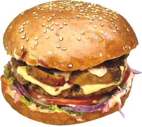 Двойная котлета из говядины и свинины, сыр российский, помидор, огурец маринованный, салат, лук красный, соус барбекю, чесночный соус, булочка с кунжутом