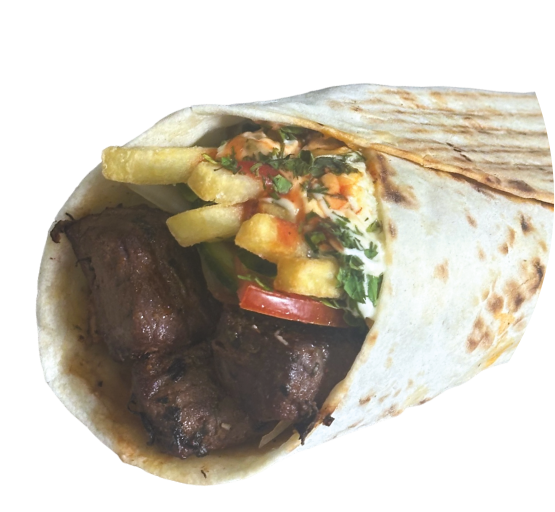 Говядина, лист салата, помидор, огурец, картофель фри, репчатый лук, укроп, петрушка, соус чесночный, соус острый, кетчуп, лаваш