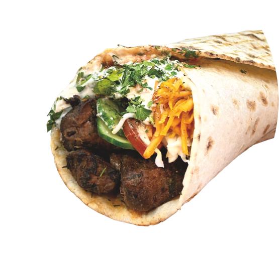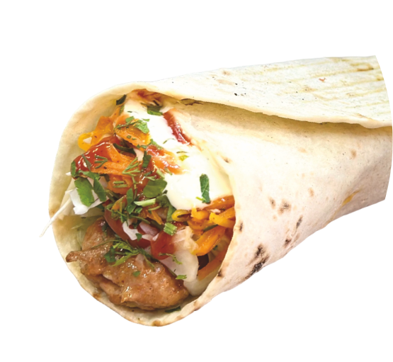 Баранина, помидор, огурец, белокочанная капуста, морковь по-корейски, репчатый лук, укроп, петрушка, соус чесночный, соус острый, кетчуп, лаваш