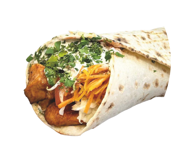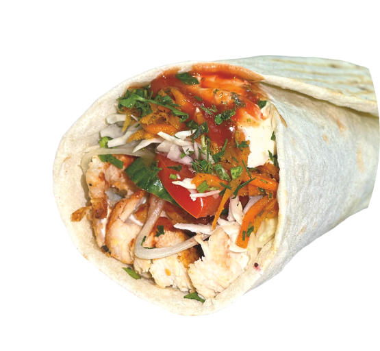 Куриный люля, помидор, огурец, белокочанная капуста, морковь по-корейски, репчатый лук, укроп, петрушка, соус чесночный, соус острый, кетчуп, лаваш