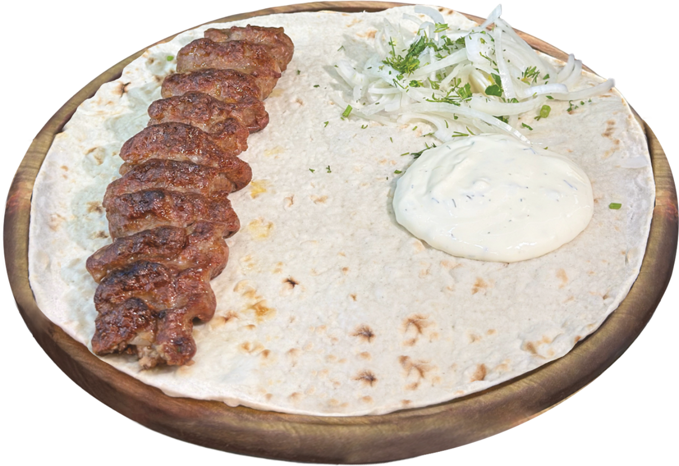 Говядина, свинина, лук репчатый, петрушка, укроп, чесночный соус, лаваш