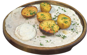 Картошка, петрушка, укроп, соус чесночный